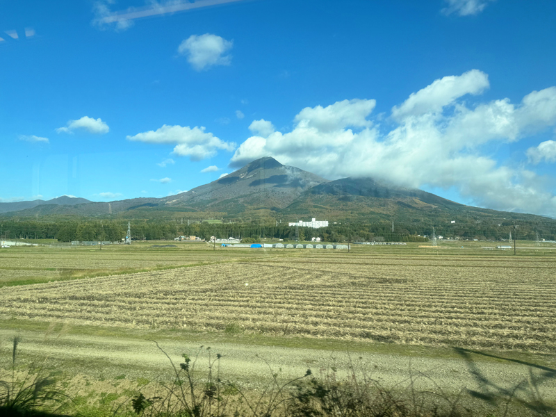 磐梯山はこのあと、列車の右手から左手へと忙しなく顔を見せ、さらに列車はゆるやかにカーブを描きながら山々を抜けていきます。
