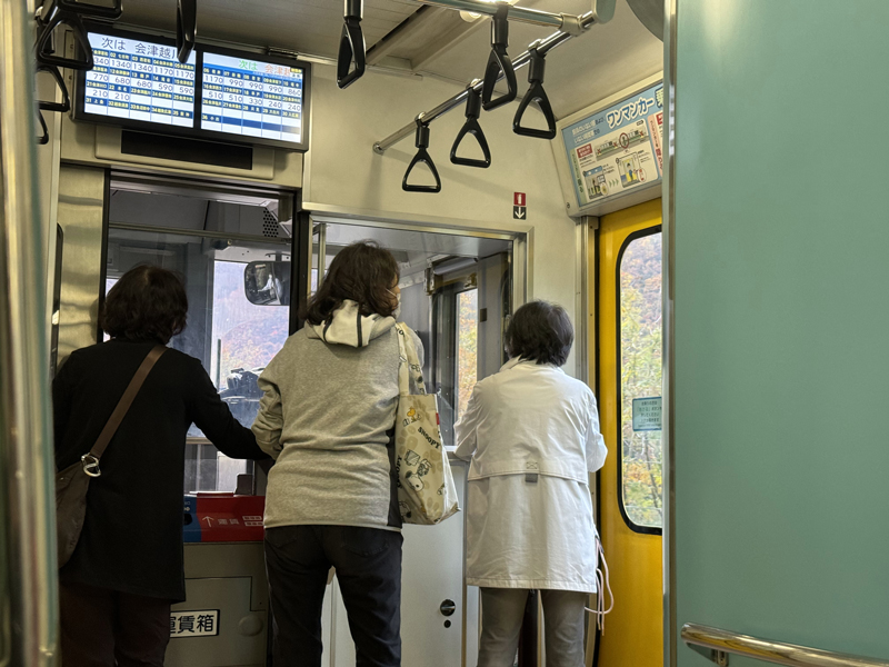 車内は昨日ほどの混雑はありませんが、それでも席はほぼ埋まっています。特に、年配の女性グループが多く、和やかな雰囲気です。