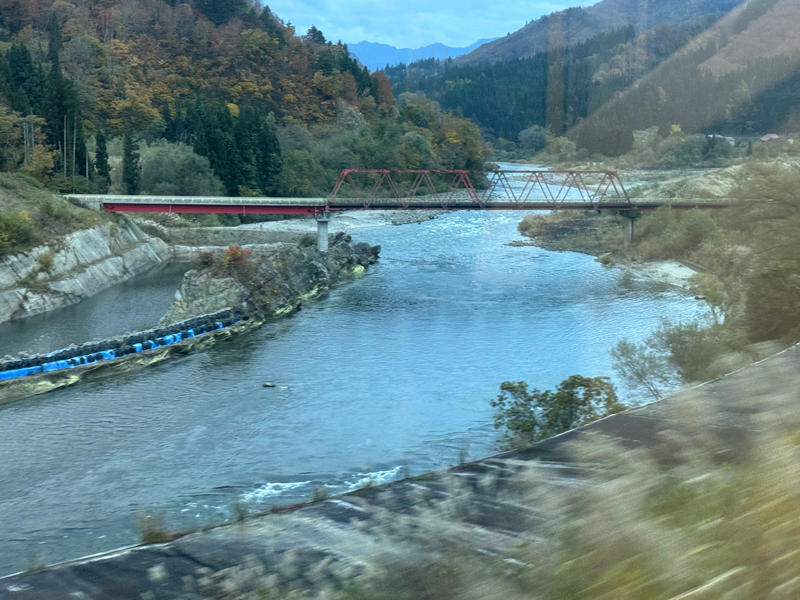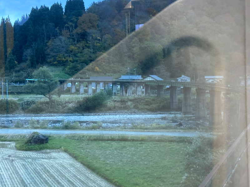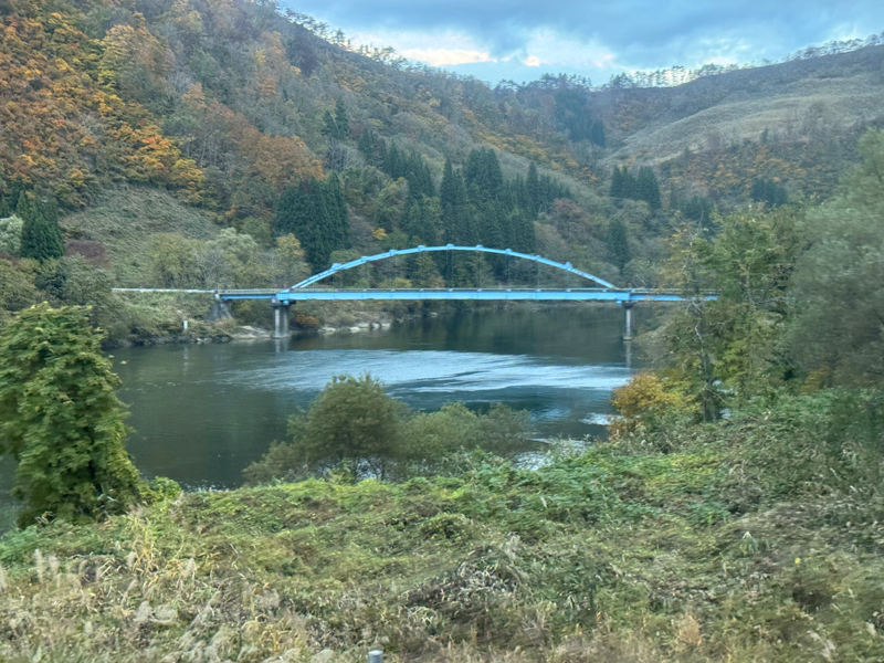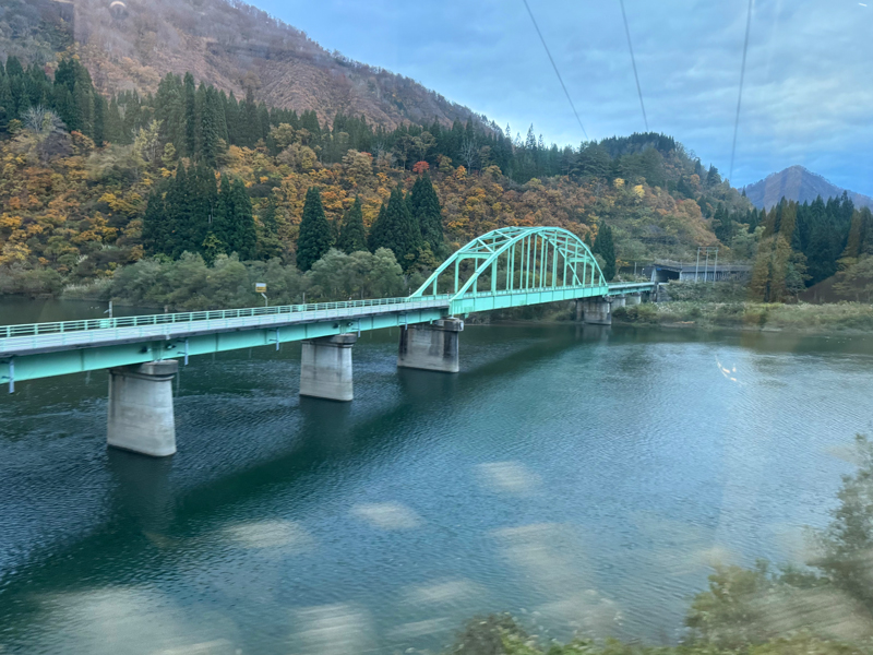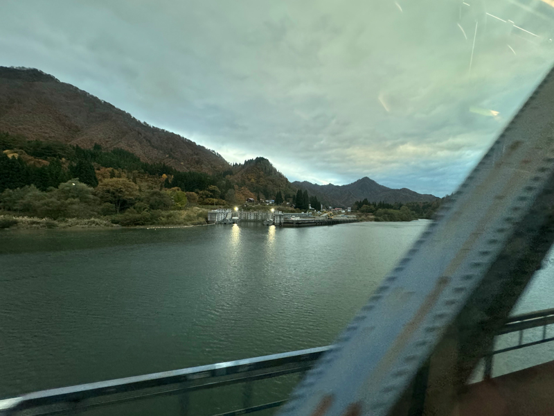 出発から25分少々、列車は第七只見川橋梁を渡ります。この鉄橋の向こうには、昨日宿泊した宿のある景色が見えます。