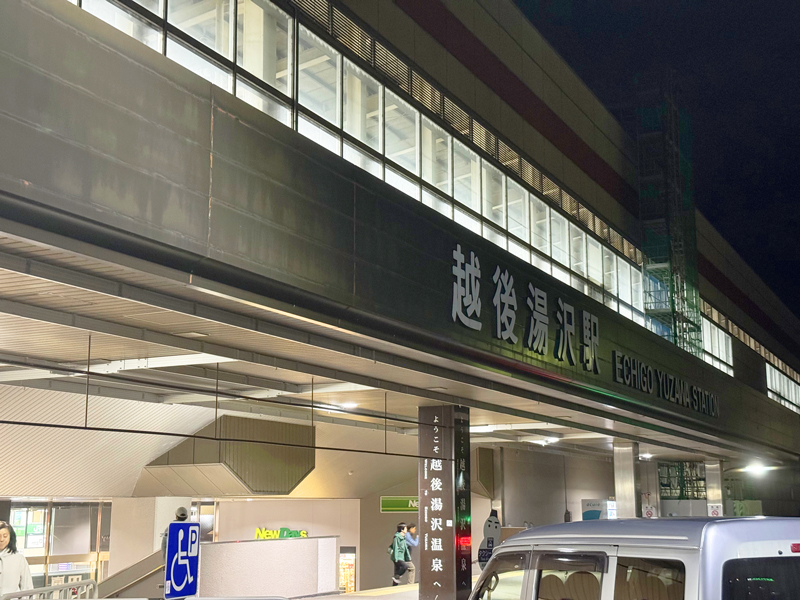4両編成の列車は通勤・通学の時間帯と重なり、車内は思った以上に賑わっていました。窓越しに見える夕暮れの景色を楽しみながら、40分ほどの乗車で越後湯沢に到着です。