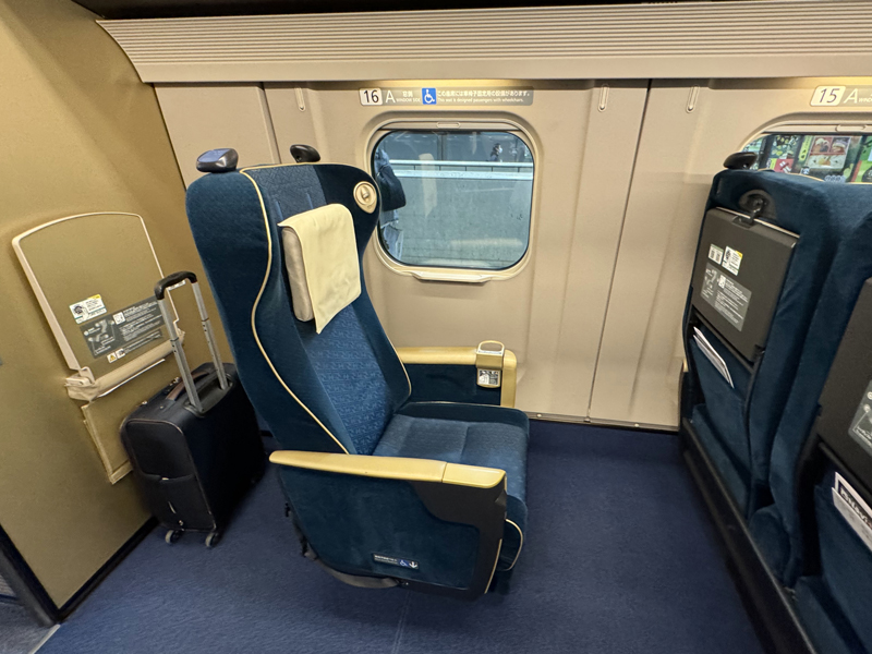 11号車にあるグリーン車は広々としており、席に設置されたコントローラーでリクライニングやレッグレストの調節が可能です。割り当てられたのは16A、最後尾の一人用座席。静かで快適な空間に座り込み、車窓を眺めながら旅の続きを楽しみます。