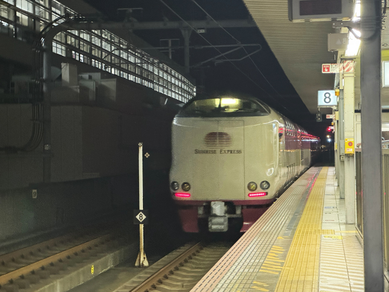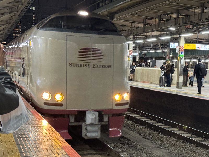 PM9:25。ホームに入線した14両編成のサンライズエクスプレスが輝くヘッドライトを灯しながら現れました。ホームは旅行者や鉄道ファンで賑わい、カメラのシャッター音が響きます。
