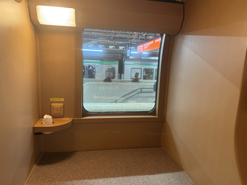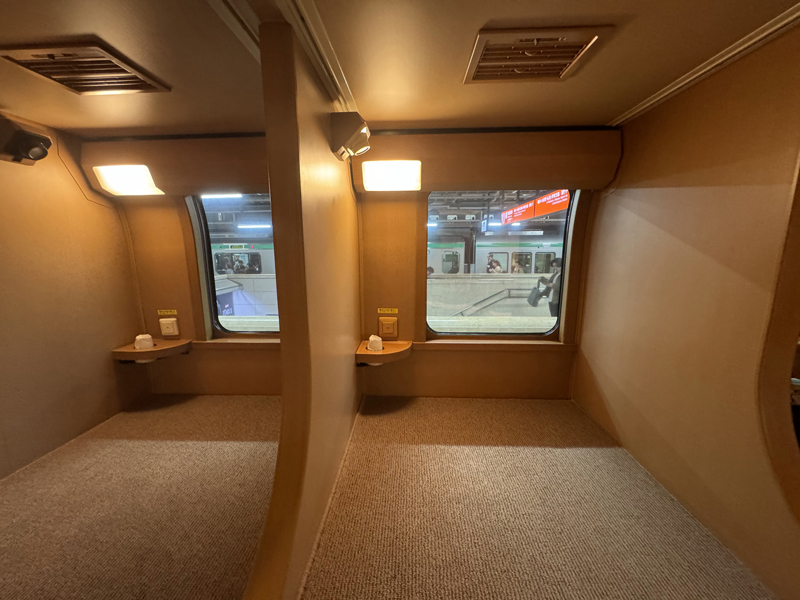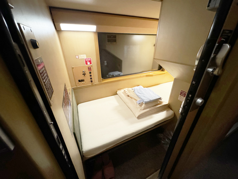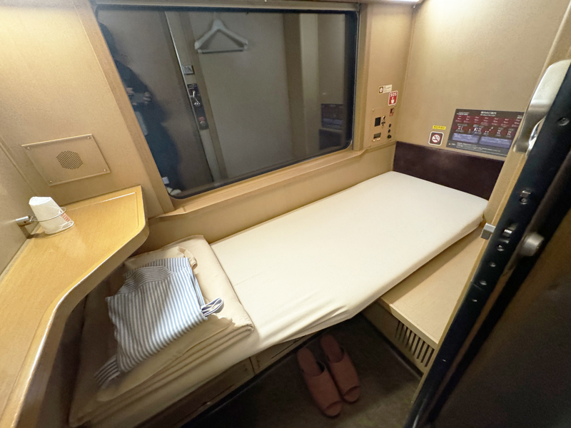 そのほか、シャワー室やミニサロンも備わり、走るビジネスホテルそのもの。夜の静かな車内を歩きながら、鉄道旅の魅力を再確認します。