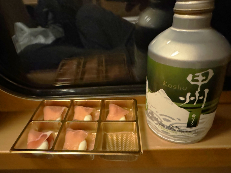 PM9:50、列車は東京駅を出発。白ワインとつまみを楽しみながら、最後の夜を過ごします。