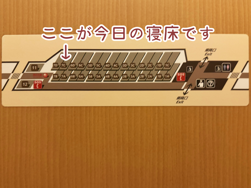 今回は2階の7C。コンセントはありませんが、足を伸ばして横になれる十分な広さがあります。