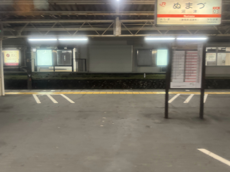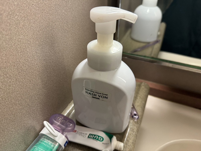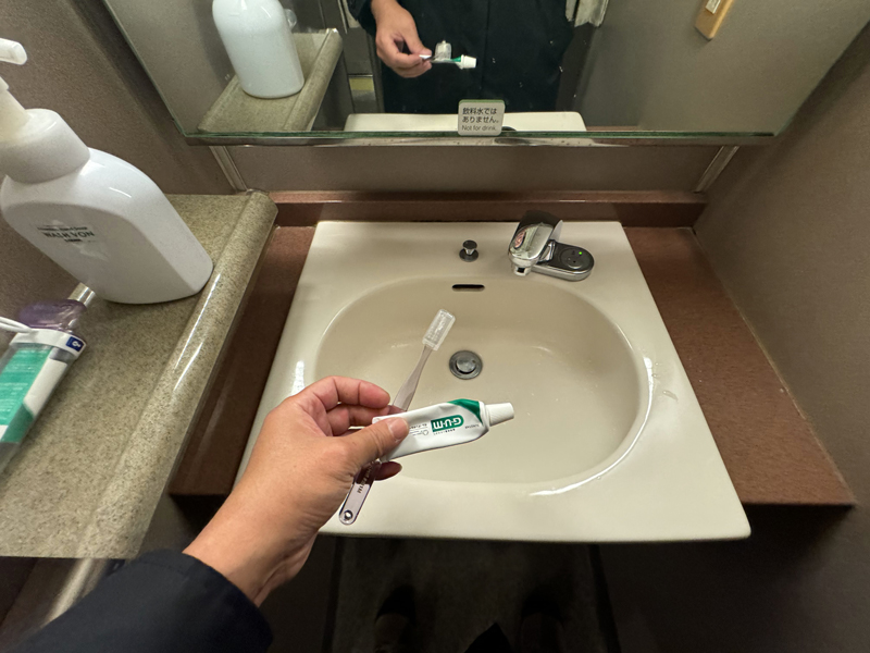 PM11:22、熱海駅を通過。眠気が訪れたので、洗面台で歯磨きを済ませ、就寝準備に取り掛かります。