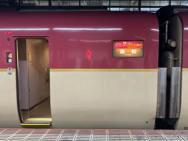 神戸を過ぎ瀬戸内海を望む車窓からはうっすらと夜が明ける青みが少しずつ広がり、旅の終わりを感じさせます。