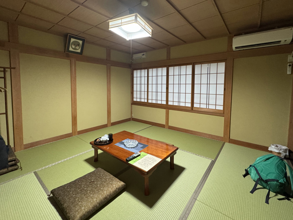 早速チェックイン。何となく懐かしくも風情を感じさせる落ち着いた民宿。玄関には大きなボンボン時計と古風な屏風が出迎えてくれます。