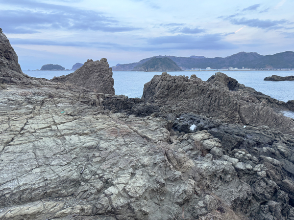 歩いていると、大きな平らな岩が並ぶ波打ち際に出ました。
