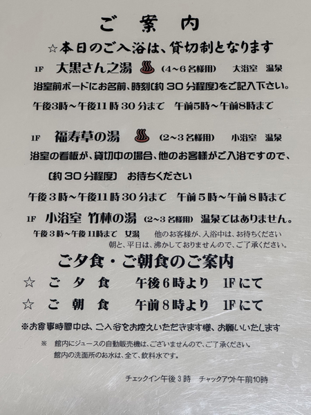 食事までまだ少し時間がありますから、お宿の天然温泉で先にひとっ風呂浴びることにしました。