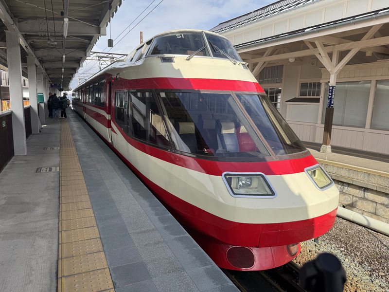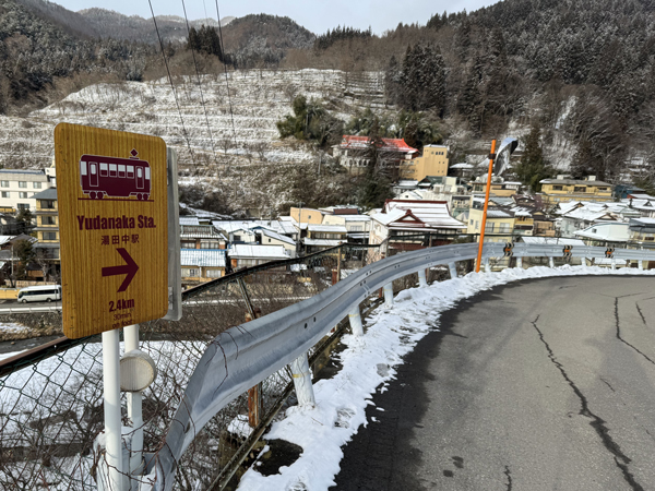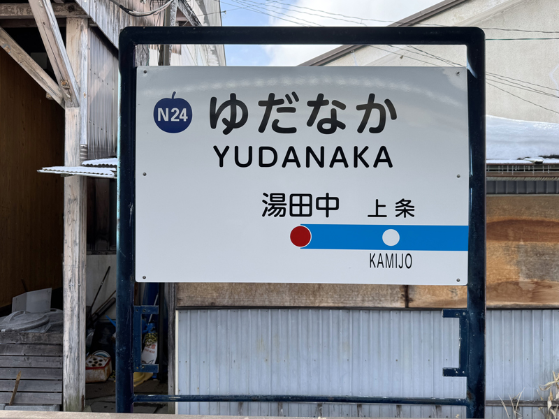 乗車してきた列車は特急「ゆけむり」。長野県は北海道に次いで全国2位(210か所)を誇る温泉地の宝庫ですが、その中でもここ湯田中は特に温泉が密集するエリアです♨