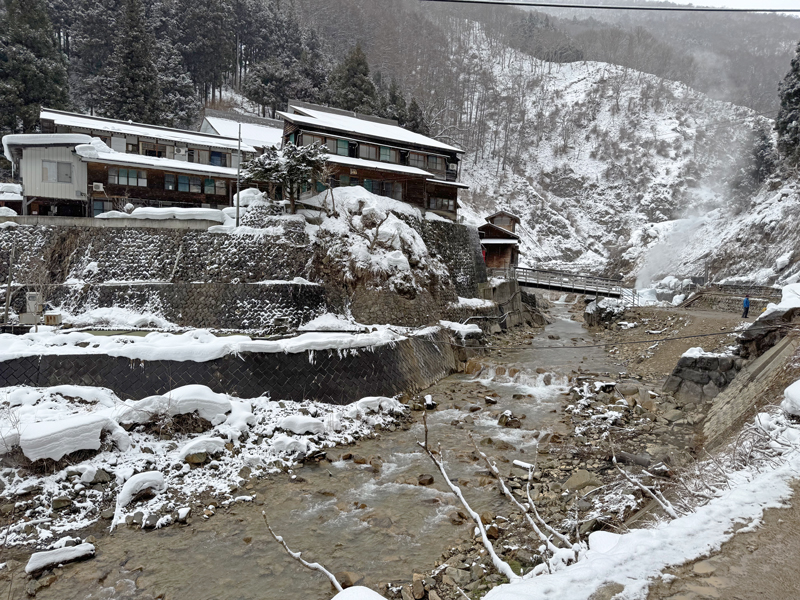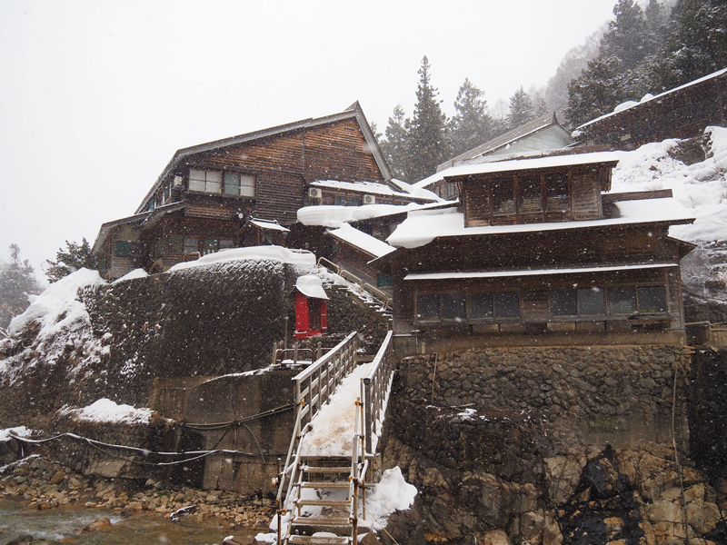 横湯川を挟んで見える秘湯「後楽館」