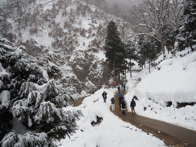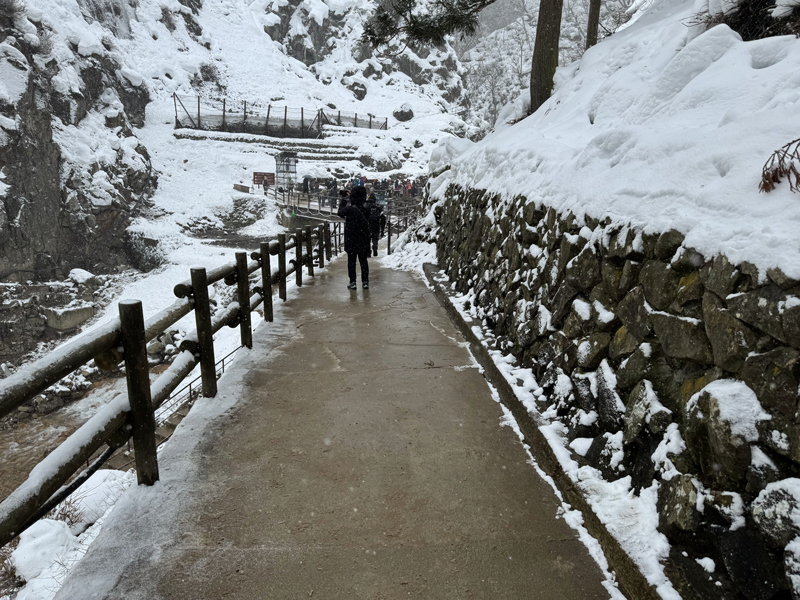 階段を上ると、すぐに左側が崖になった遊歩道が続いていました。道のあちこちが凍結していて、油断するとすぐに足を滑らせそうです。私も何度か転びそうになりながら慎重に進んでいきます。