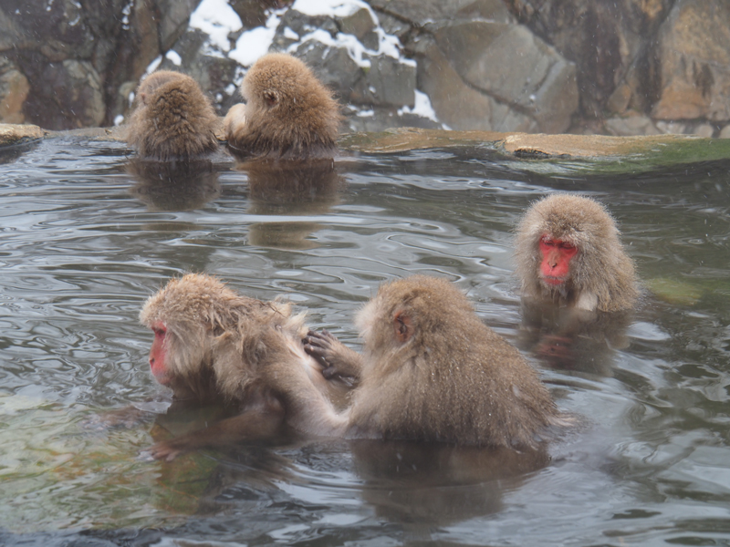 毛づくろいをし合ったり、時には小競り合いをしたりと、温泉の中でもモンキーライフドラマが繰り広げられています。