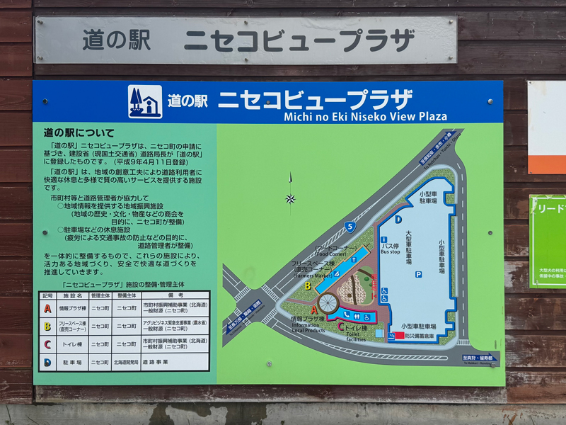 この道の駅は、観光案内と特産品販売を行う「情報プラザ棟」、地元の新鮮野菜が並ぶ農産物直売所やテイクアウトグルメが揃う「フリースペース棟」、そして「トイレ棟」の3棟からなります。広々とした敷地内にはニセコ観光に役立つ情報が満載。