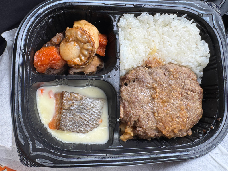 私たちは、店内で販売されていた「世界を旅するお弁当」シリーズから、「北海道」と「北イタリア」をチョイス。冷凍お弁当ですが、その場で電子レンジが使えるので、熱々でいただくことができます。