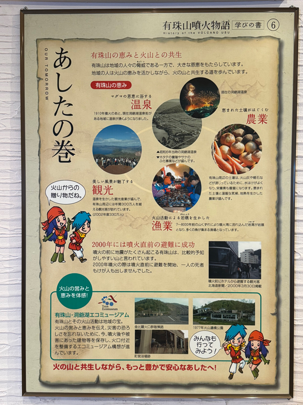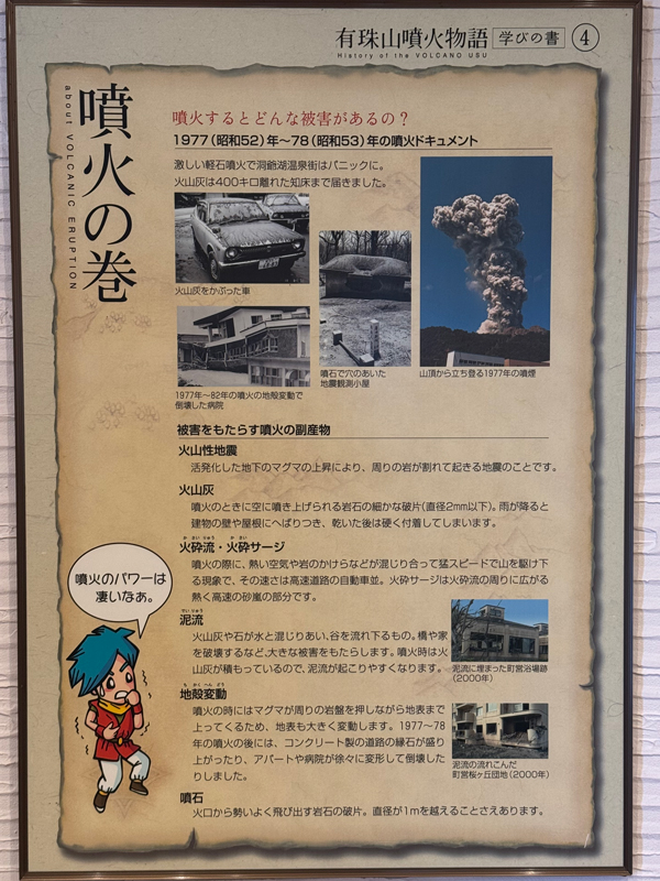 ロープウェイ乗り場に併設された「洞爺湖有珠山ジオパーク 火山村情報館」にも立ち寄り、火山と温泉地の密接な関係についてさらに理解を深めました。
