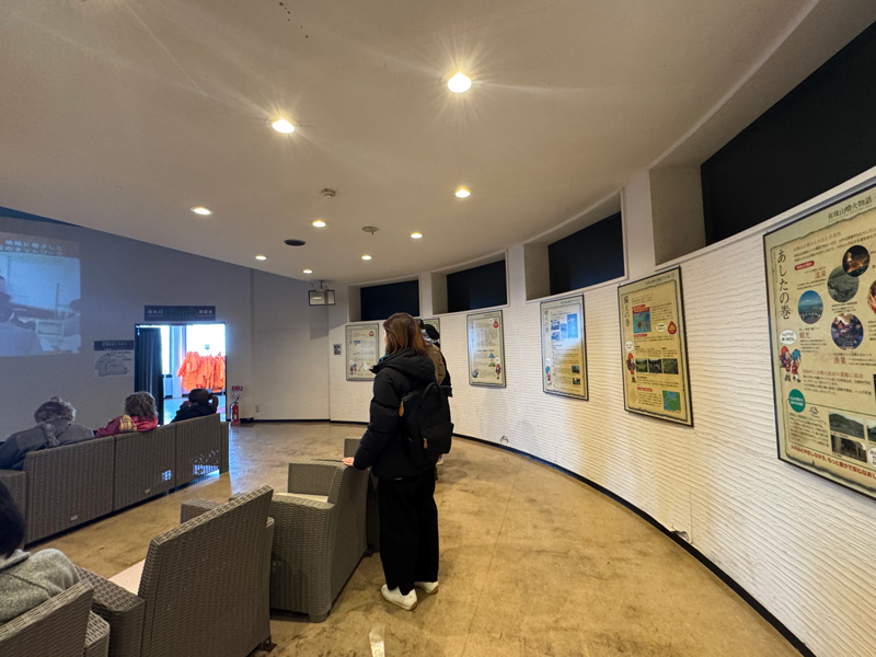 待合室には、有珠山の噴火の歴史や火山のメカニズム、そして洞爺湖の成り立ちがわかる展示や映像があり、学びの時間としても充実。