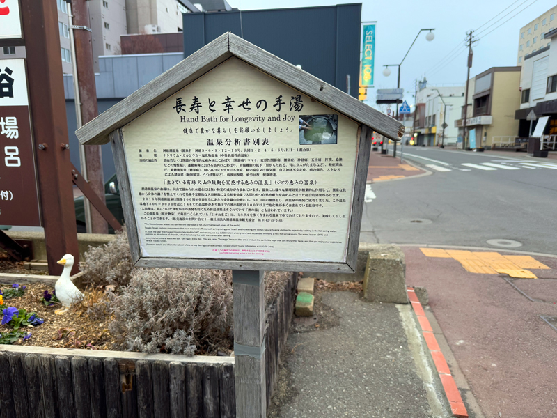 暗くなる前に、洞爺湖温泉街と湖岸をぶらりと探訪。まずは宿の目の前にある「洞爺湖温泉ストリート」を歩いていると、さっそく「手湯」を発見。