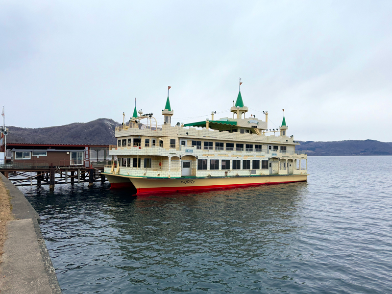 そこに停泊していたのが、なんともメルヘンなデザインの遊覧船「エスポアール」。この日はもう営業終了でしたが、通常は8:30~16:30の間、30分おきに出航して湖中央の火山島「中島」へと向かうそうです。