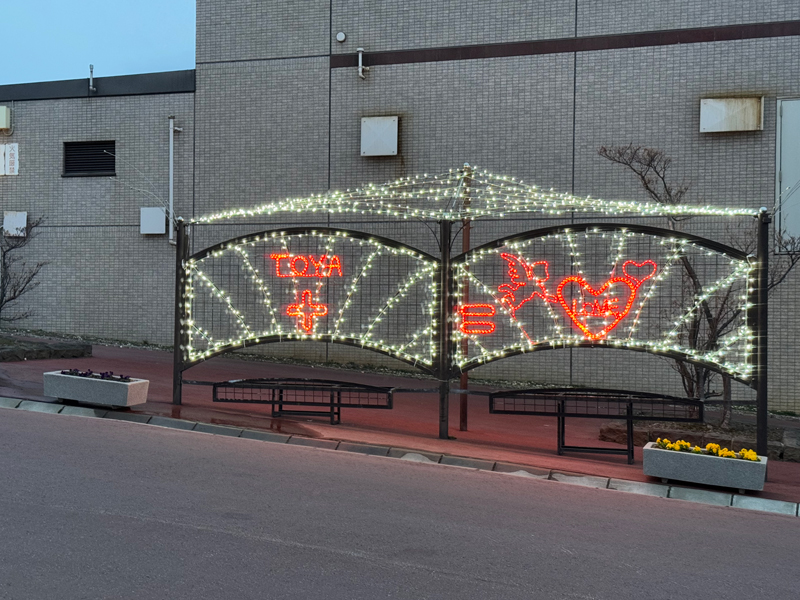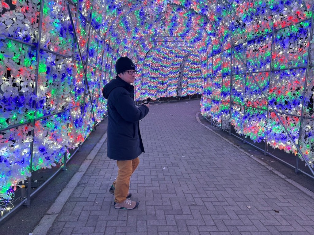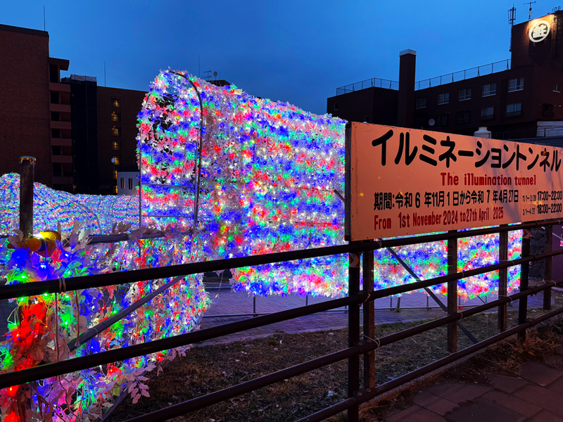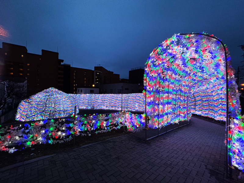 洞爺湖温泉の中心「にぎわい広場」には、約40万球の電飾で彩られた光のトンネルが出現。中に入ると、色とりどりの光が幻想的な世界をつくり出し、まるで別世界に迷い込んだかのよう。……いやぁ~テンション上がる⤴