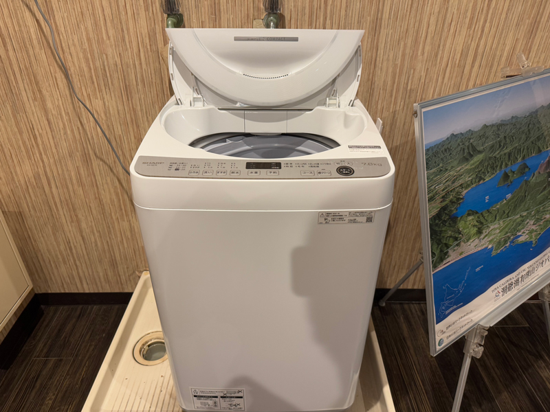 早速お風呂へ直行♨️もちろん源泉かけ流し。嬉しいことに、無料の洗濯機まで完備されていて、我が家もありがたく使わせていただきました。奥には自販機でアルコールも買えますし、電子レンジもあって何かと便利!