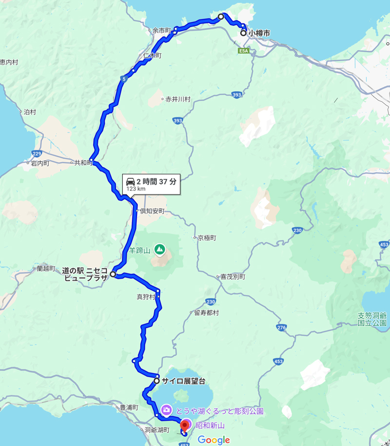 本日のドライブは、高速道路を使わずにのんびりと下道で。移動距離はおよそ130km弱。途中、ニセコを経由して向かいます。まずは国道5号線を南下しながら、ゆっくりと景色を楽しみましょう。