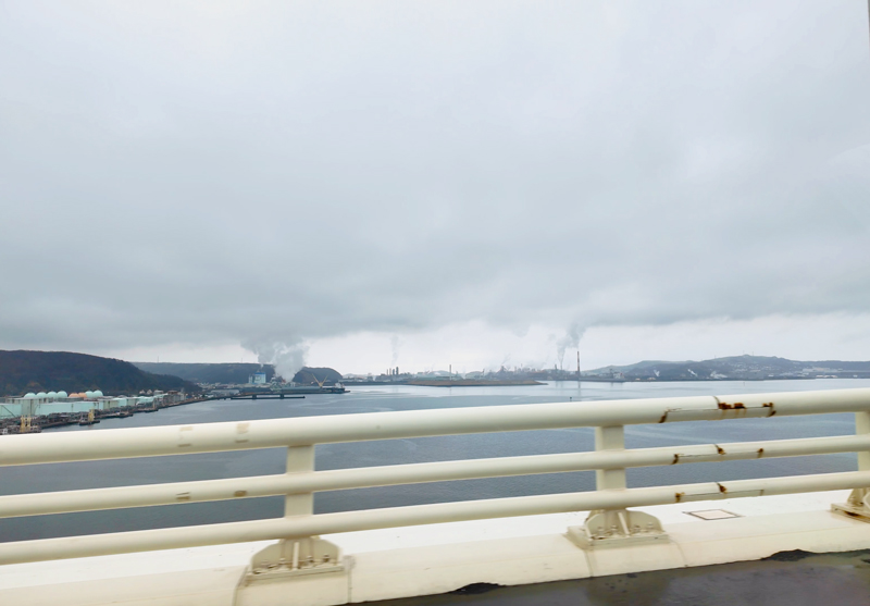 洞爺湖から車で50分ほど。国道37号線を進んでいくと、工場の煙突が並ぶダイナミックな光景が目に飛び込んできます。いよいよ室蘭に入りました。