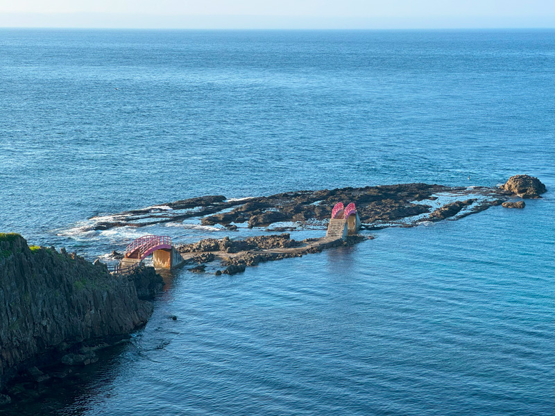 岬ã®è¥¿åŽã«åºãã岩ç€ã«ã¯ãã¿ã³å²©ããšåŒã°ããã²ãšãã巚倧ãªäžžãå¥å²©ãå§¿ãèŠããåããã«ã¯æŽ¥è»œæµ·å³¡ã®å€§æµ·åãåºãããŸãã