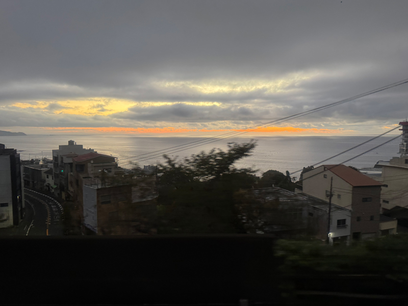 目を覚ますと、列車はすでに熱海を過ぎたあたり。窓の外には相模湾の水平線が広がり、空が少しずつ白んでいきます。