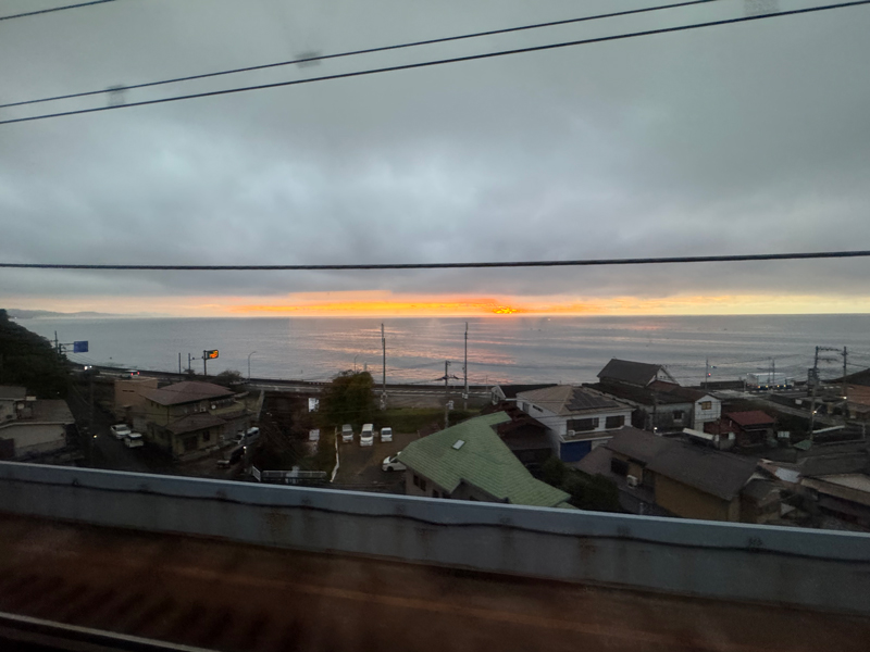 車窓からの景色はどんどんとくっきりしてきまして、小田原駅を過ぎた辺りで朝日が煌々と昇り始めます🌅サンライズ!