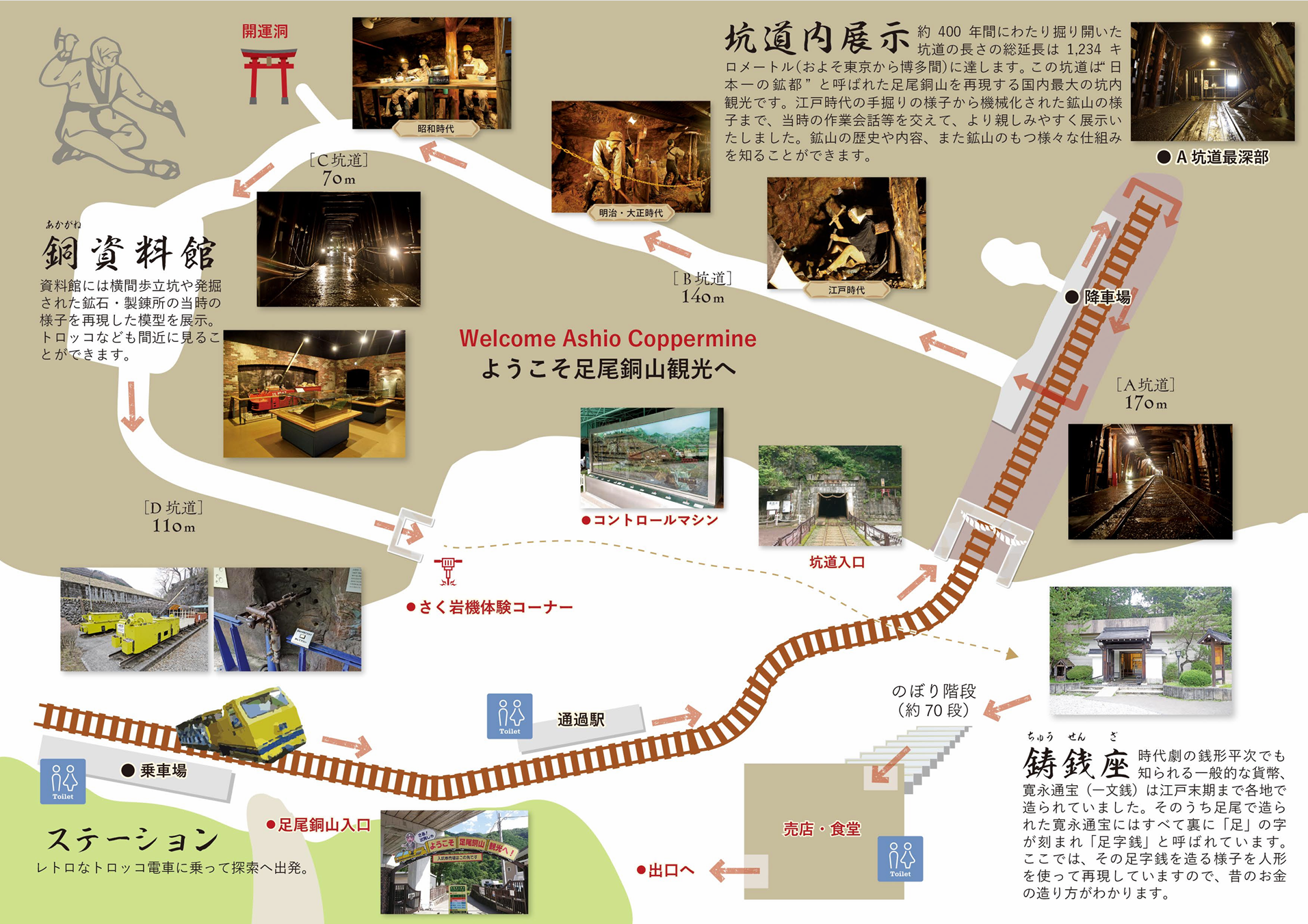1980年に観光施設「足尾銅山観光」として生まれ変わり、実際の坑口からトロッコで入る体験型施設として、当時の姿を伝えています。