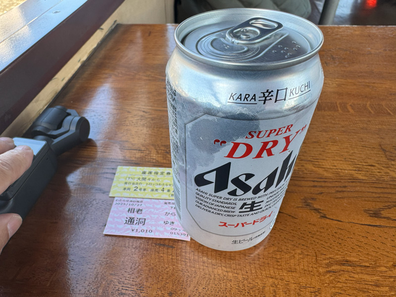 荷物を座席に置き、まずは車内の自販機でビールを購入🍺