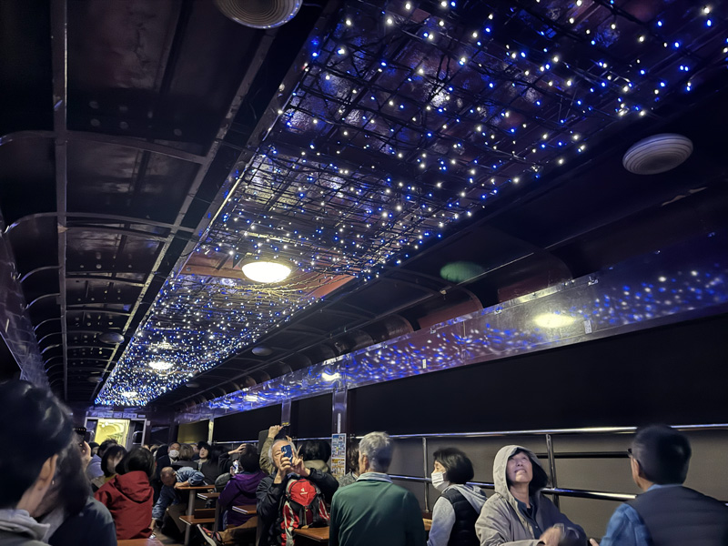 トンネル内では天井にイルミネーションが点灯し、幻想的な光が車内を包みます。