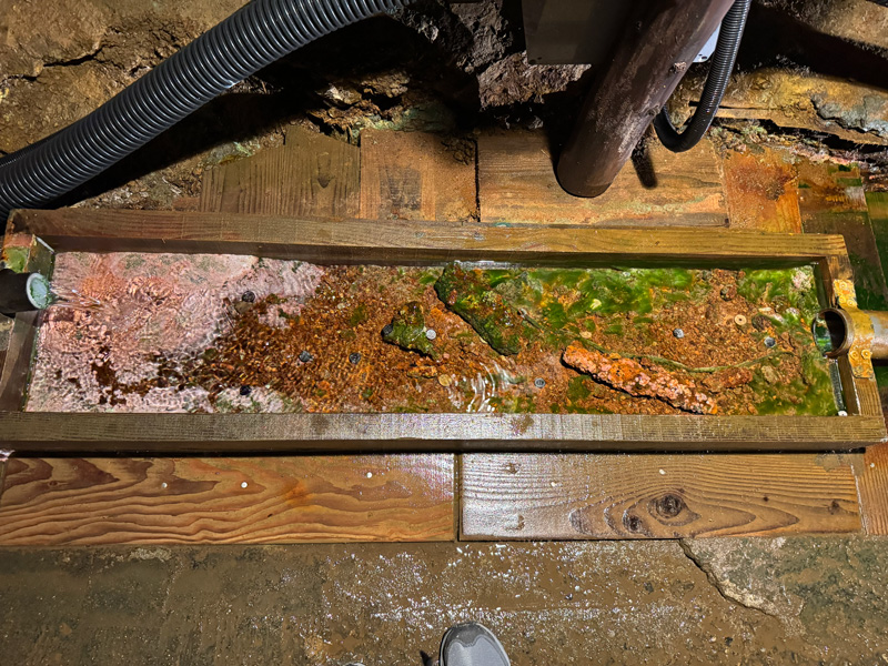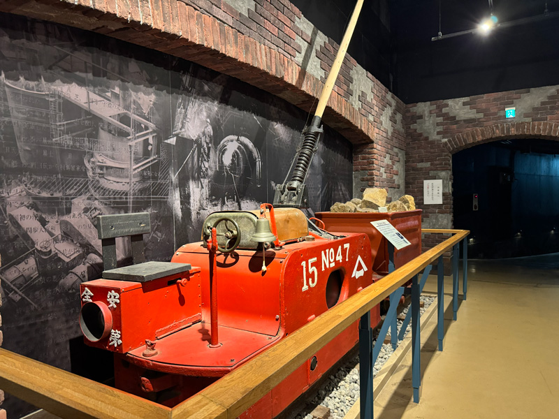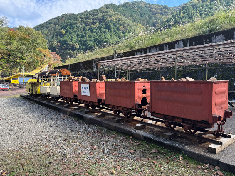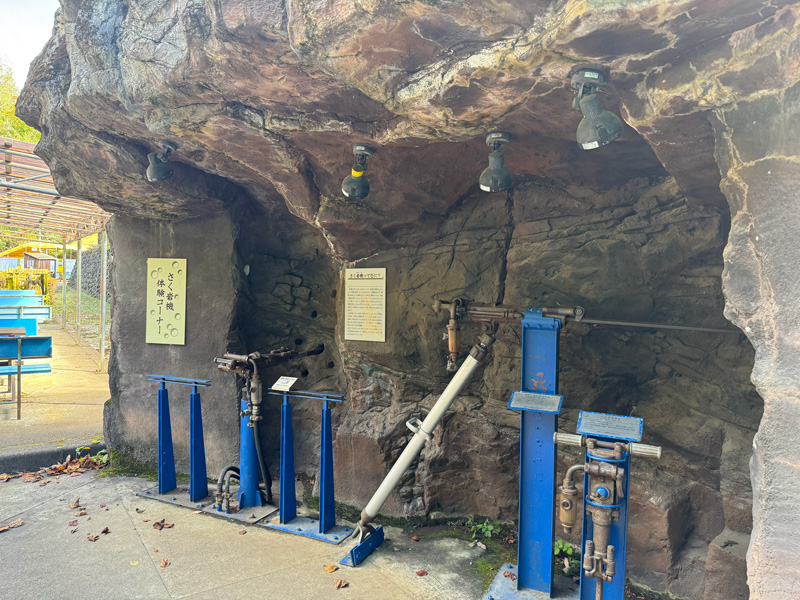 坑道を出ると、再びトロッコのトンネル入口付近へ。実際に使われていた貨車や精錬所跡、削岩機などが展示され、最後まで見応えがあります。