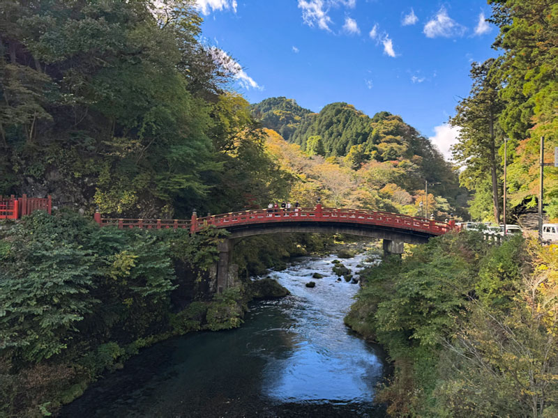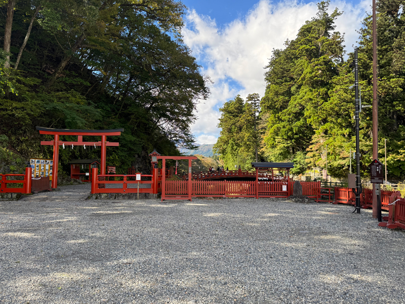 石段を降りて戻ってくると、視界に飛び込んでくるのは真紅の太鼓橋「神橋」。奈良時代末期、勝道上人が日光山を開いた際、深沙王が2匹の蛇を放って橋を作ったという伝説が残り、日本三大奇橋のひとつに数えられる神聖な橋です。