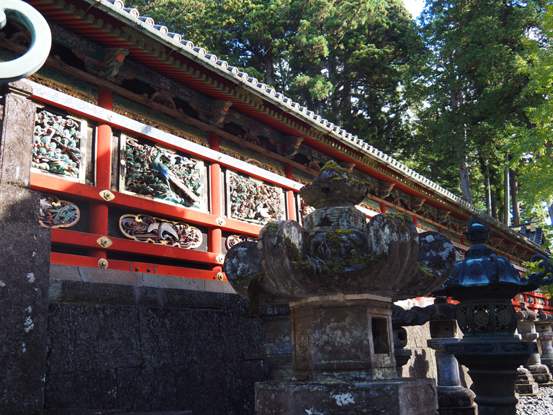 陽明門の左右には、神域を守る全長約220mの回廊が広がり、南面には日本最大級の花鳥の大彫刻25枚が並びます。