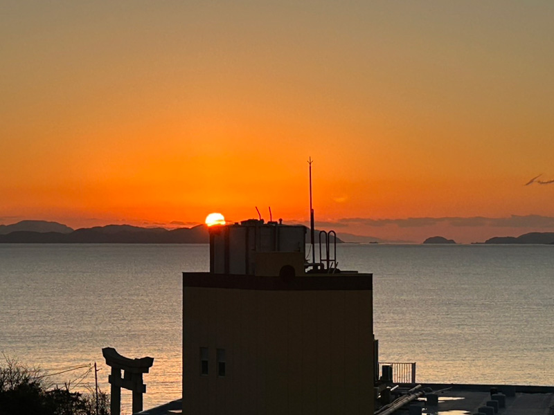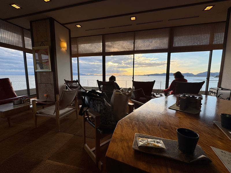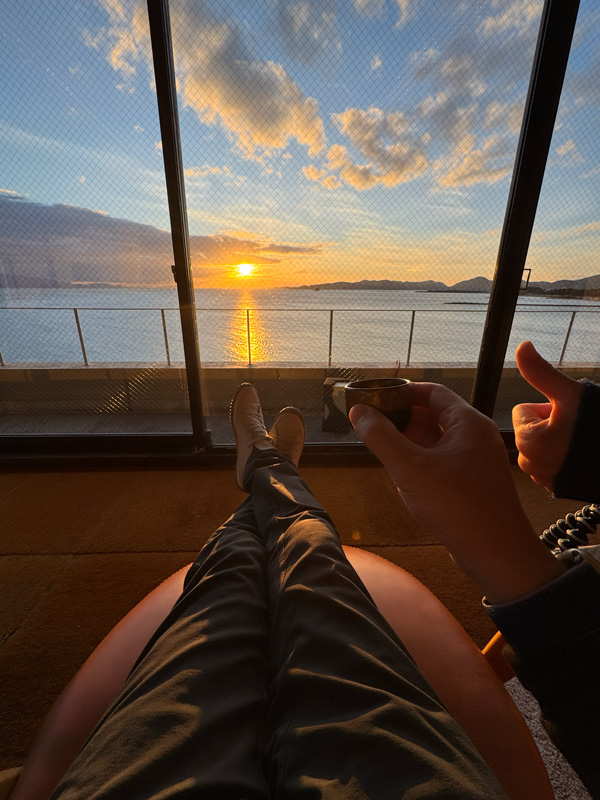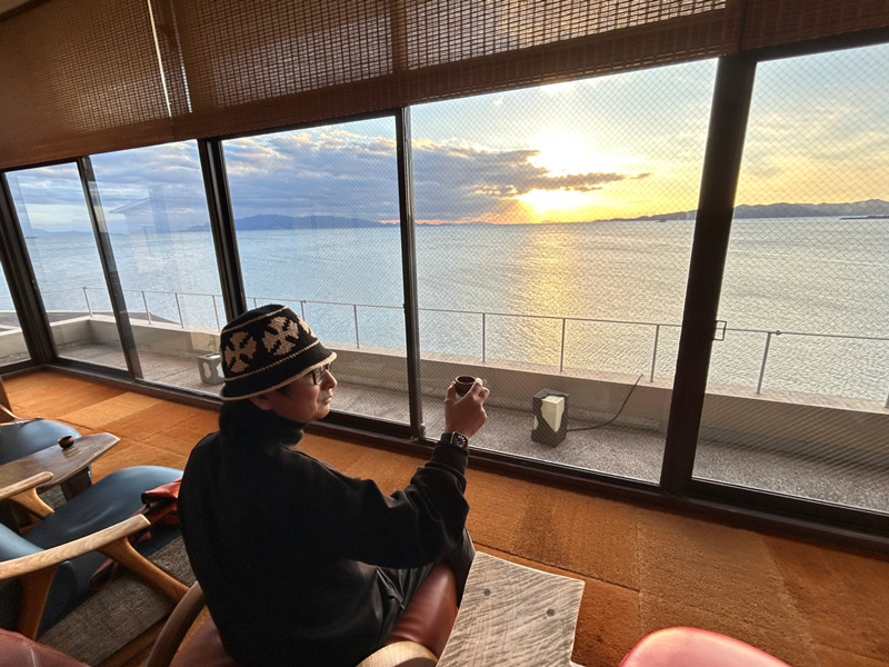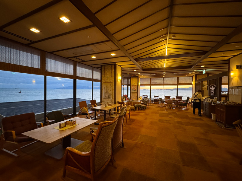 瀬戸内の海と夕陽、空を一体で感じられる造りになっており、水面に映る夕景が印象的でした。