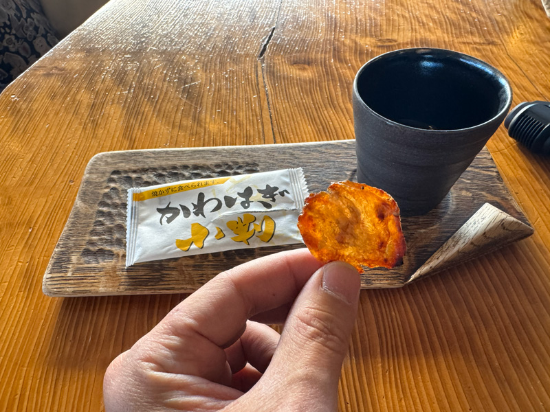 お部屋の準備が整うまで、柚子茶とお菓子をいただきながら、椅子の座り心地と景色を楽しむ時間。