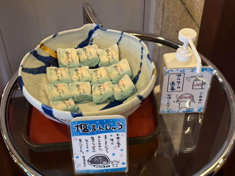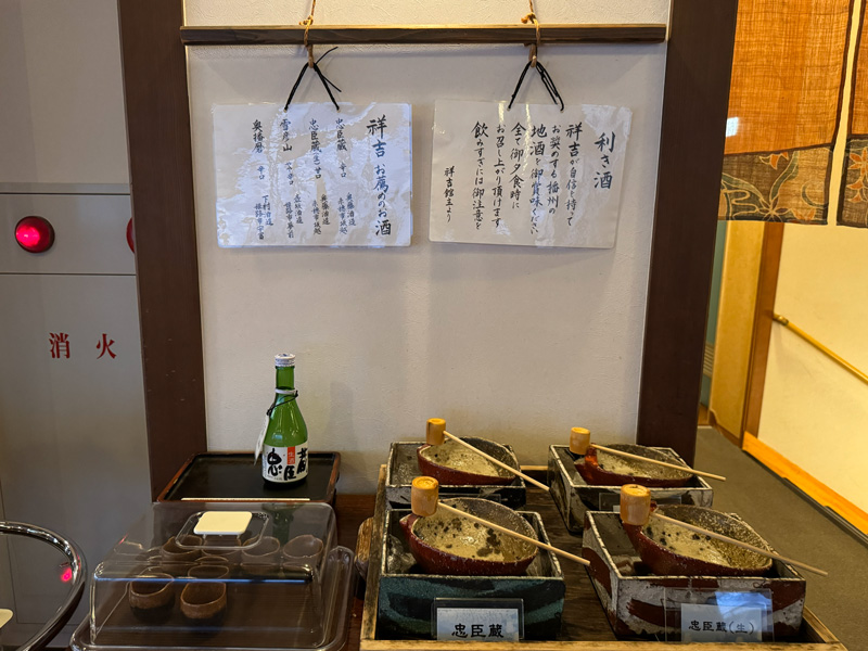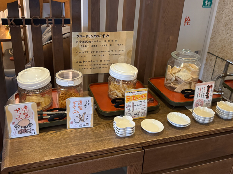 ロビーでは、日本酒の飲み比べや赤穂のご当地おつまみ、お菓子、コーヒーなどが自由に楽しめるとのこと。