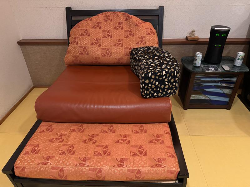 上段には、宿こだわりの巨大キューブチェアが置かれ、夜にはベッドへと変形します。