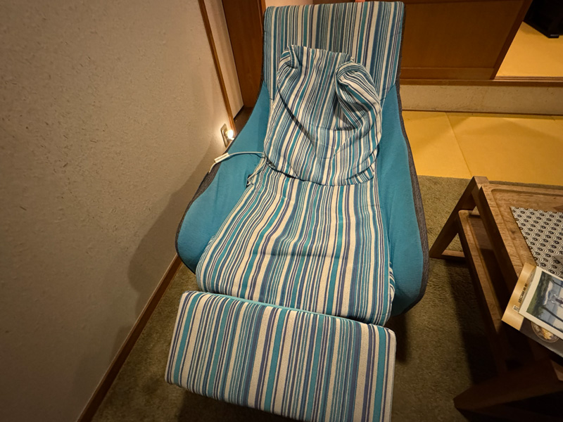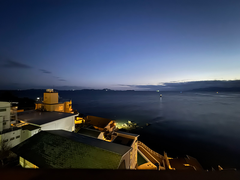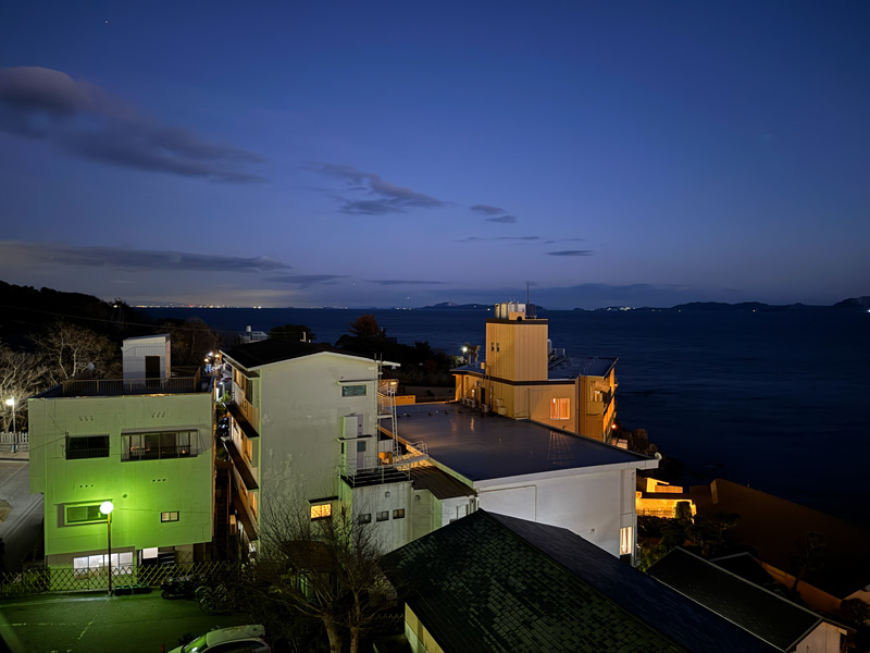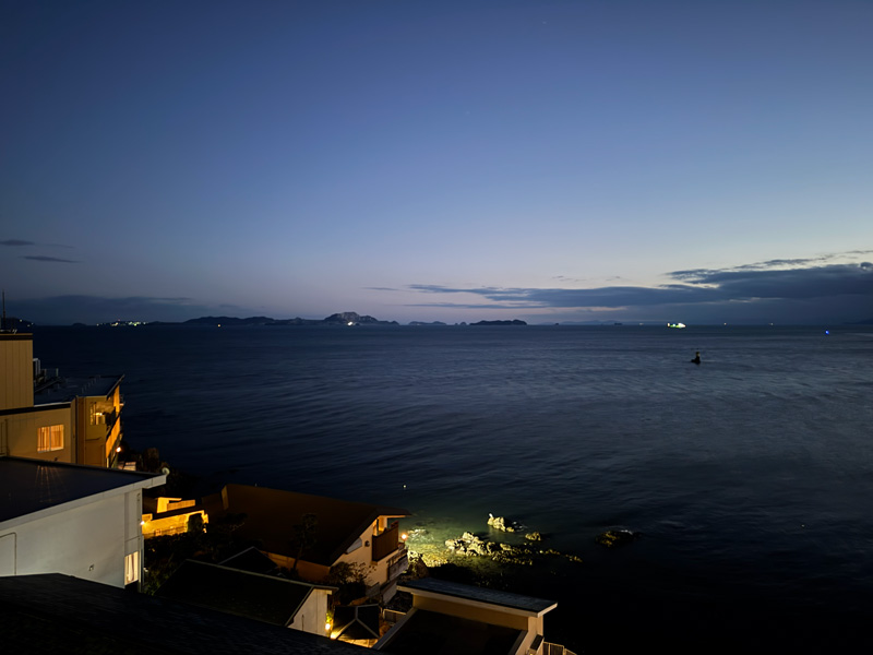 マッサージチェアで体をほぐしながら、夜の漁火が灯る瀬戸内海を眺めます。