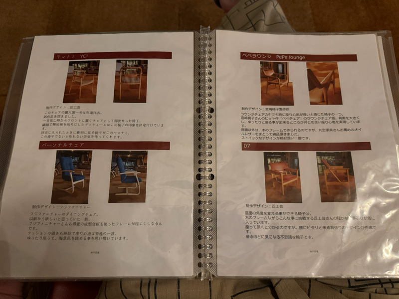 これらは、ホテルが工房から取り寄せた限定チェアとのことで、どれも座り心地を試してみたくなるものばかり。