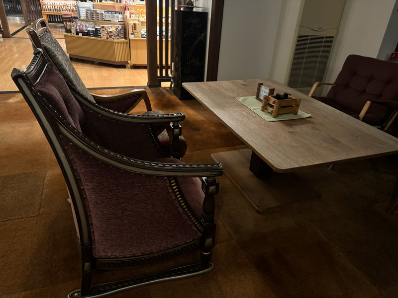 温泉に行くか迷いつつ、まずはロビーでひと休みすることに。