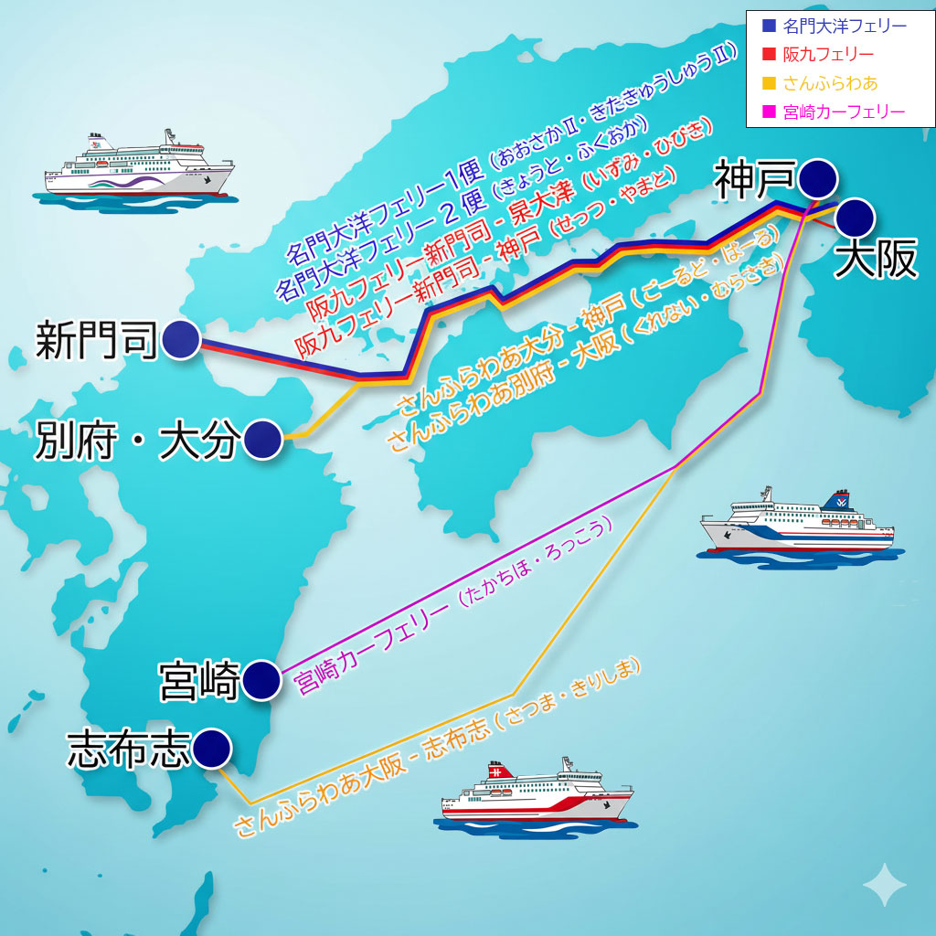 - フェリーさんふらわあ(大分 ― 神戸 / 別府 ― 大阪 / 志布志 ― 大阪)