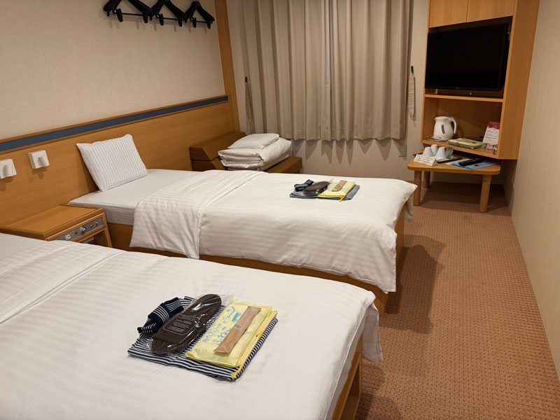シングルベッド2台、テレビ、冷蔵庫、トイレ、洗面台完備。