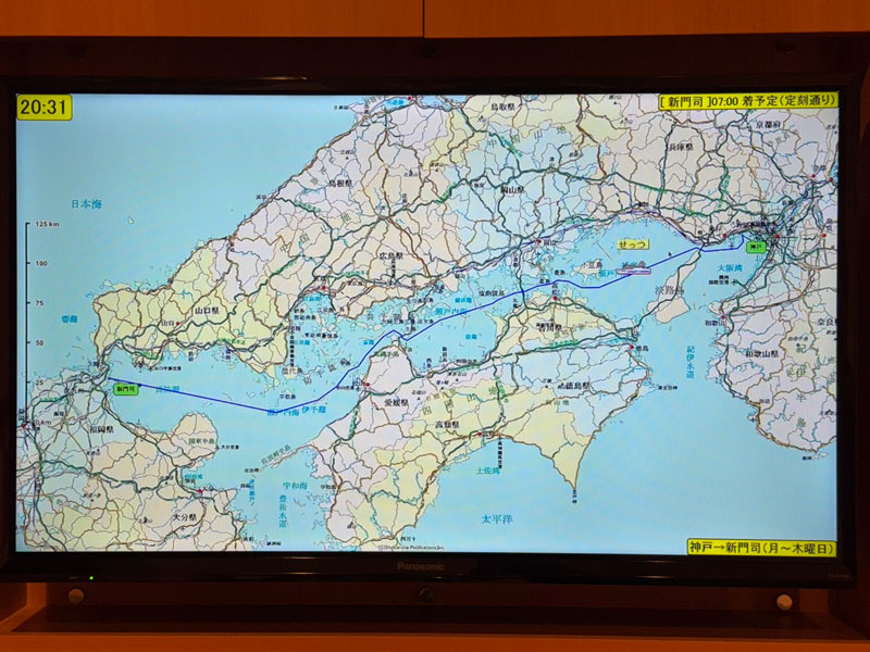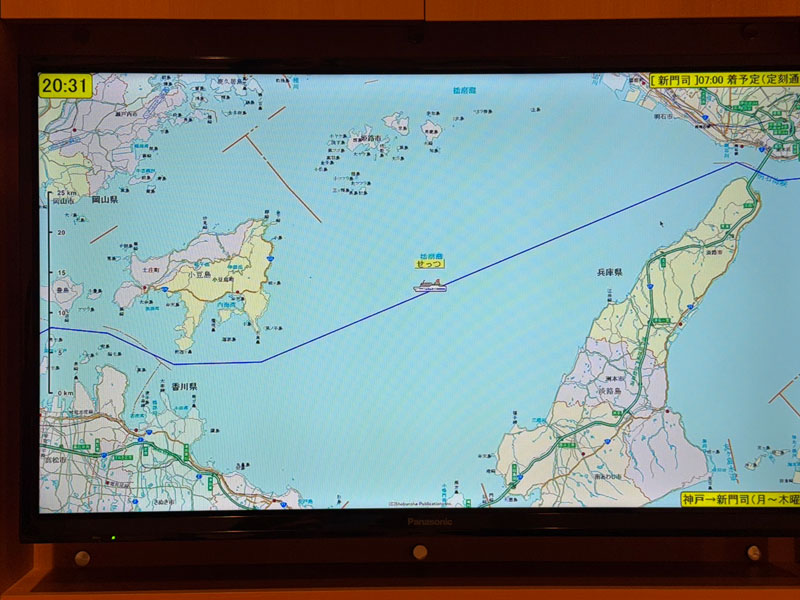 客室のテレビは、この海側の位置だと地上波も映りますが、BSの方が安定した高画質で楽しめます。画面で現在地をチェックしてみると、乗船から3時間、ちょうど家島諸島の南あたりを航行中。目的地までは、まだまだたっぷり時間があります。