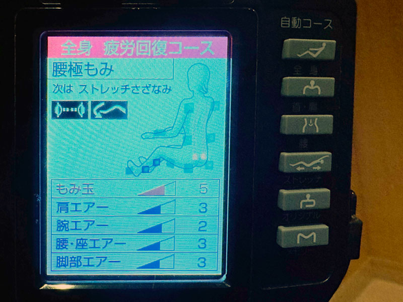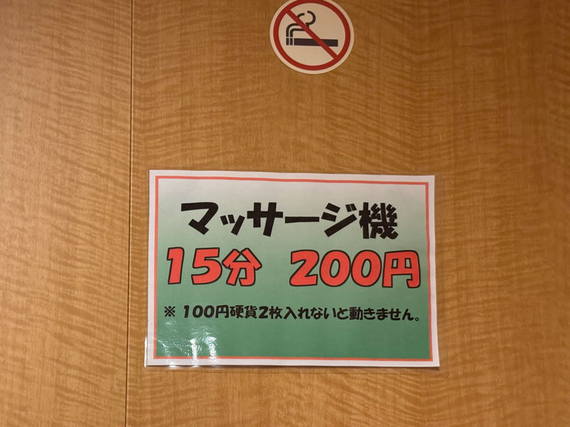 私は15分200円のマッサージチェアへ。日頃の疲れを2回分(200円✕30分間)満喫。