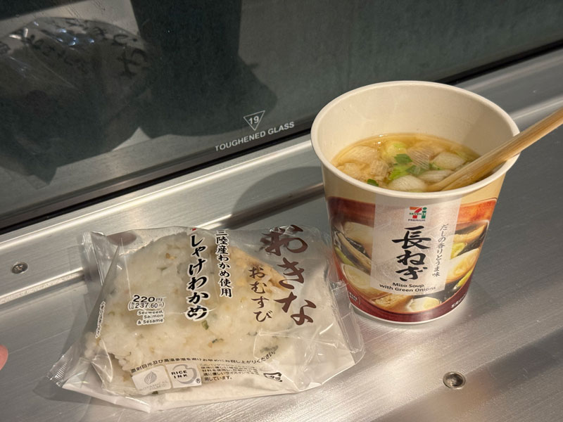 乗船前に買っておいたおにぎりと即席味噌汁で簡単な朝食。